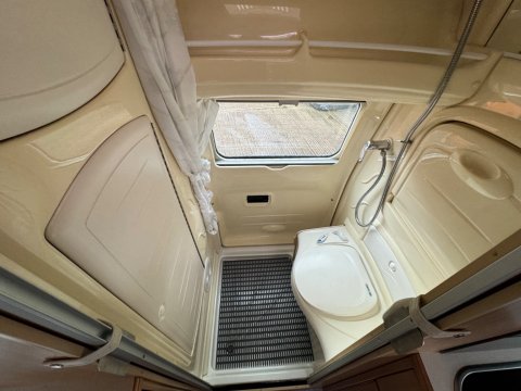 Shower room across the rear with Thetford cassette toilet, drop down basin and cupboard / storage areas.