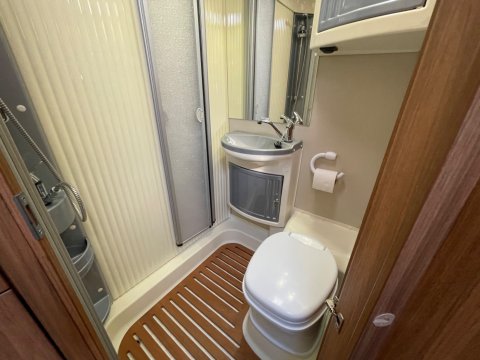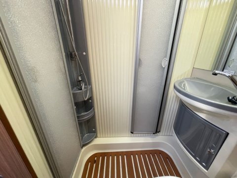 Bathroom area at the back which includes, shower / swivel cassette toilet. sink, mirror and storage unit.