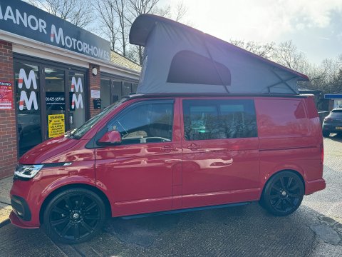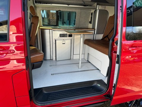 FACELIFT MODEL! Professionally converted VW Transporter HI LINE T30 base vehicle with ONLY 19,000 miles from new, 150 BHP 7 speed DSG Automatic gearbox, , Red exterior with a white and Caramel leather Diamond stitched leather interior. 21 “Inch colour coded alloy wheels, front splitter, rear spoiler, colour coded side bars. Multi function steering wheel, Electric cab windows, mirrors, central locking, media system, bluetooth, sat nav, DAB radio.