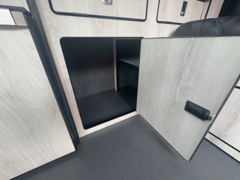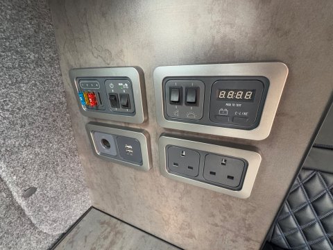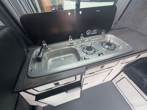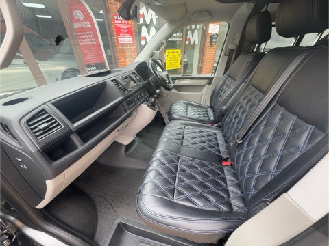 T30 High Line spec van base. 150 BHP 2.0 Litre T6 Professional conversion by West Dubs. Metallic grey exterior paint with Black leather stitched upholstery and White cabinetry interior. Cab Air conditioning, Electric cab windows, mirrors, central locking, cruise control and a manual gearbox. USB point on the dashboard and a Multi function steering wheel, Dashboard Bluetooth / Media centre