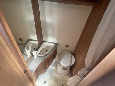 Shower room with a sink, mixer tap, Dometic cassette toilet, mirror and storage areas.